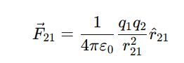 Answer: F=14πε0q1q2r2F = \frac{1}{4\pi\varepsilon_0} \frac{q_1 q_2}{r^2}F=4πε01r2q1q2